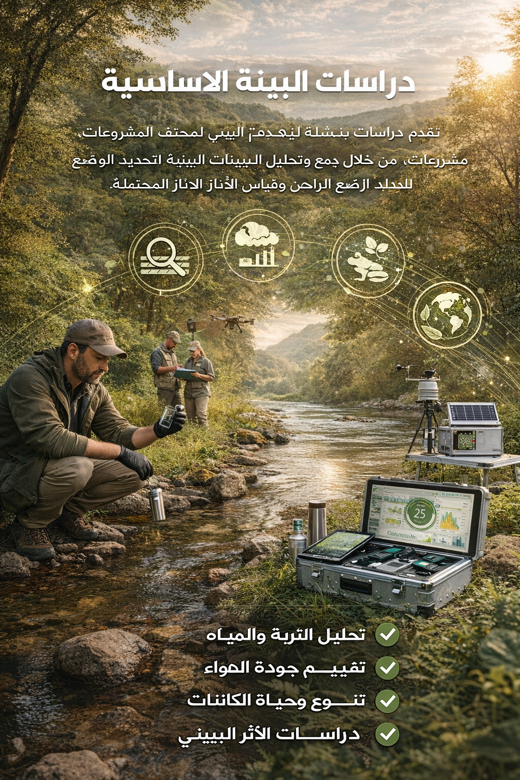 نُجري في EnviroPath مسوحات بيئية أساسية تهدف إلى توثيق الوضع البيئي القائم قبل بدء المشاريع. وتُعد هذه البيانات مرجعًا رئيسيًا لمقارنة التغيرات البيئية المستقبلية، وتقييم فعالية الإجراءات المتخذة للحد من الأثر البيئي خلال مراحل التنفيذ والتشغيل المستقبلية